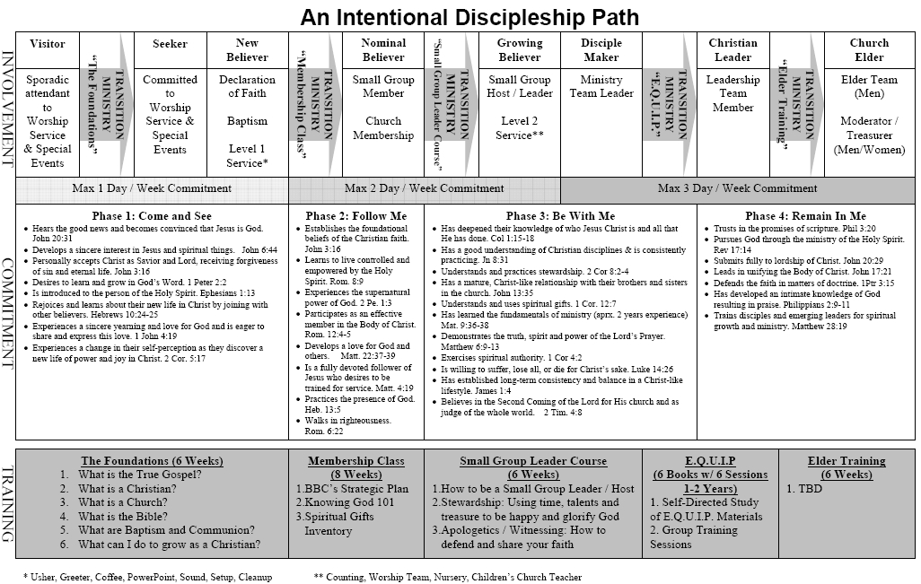 Intentional Discipleship training has been a preoccupation of mine for a long while, and I have seen far too many churches that have little interest in it. There are LOTS of ministries dedicated to it, but a low percentage of churches who are engaged in it. As I said a while back, everyone loves to see the effect of good discipline, but there are not enough that will go through what it takes to become disciplined. Think about your own spiritual journey. How intentional has it been? What steps have you followed? Who has laid out those steps for you?